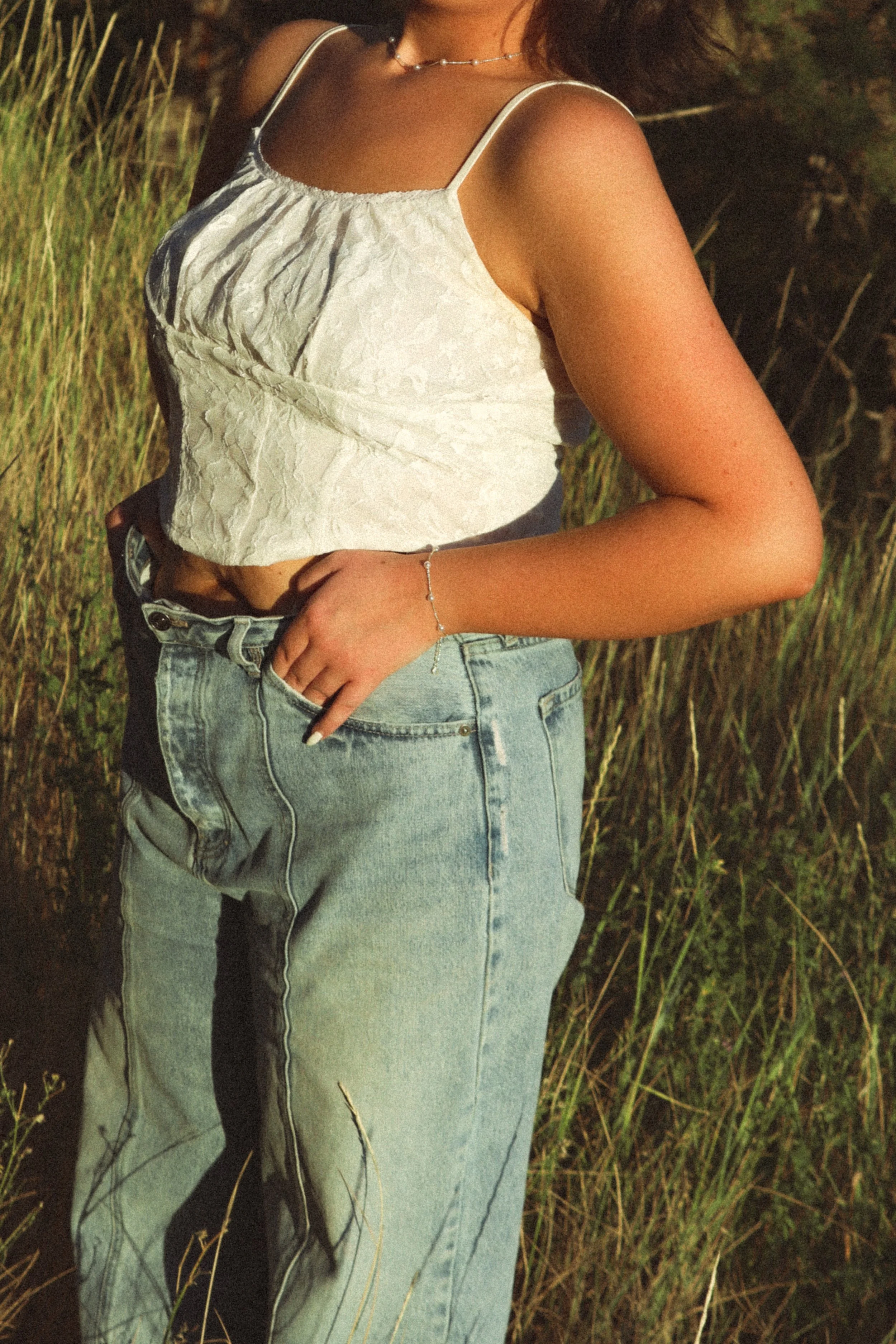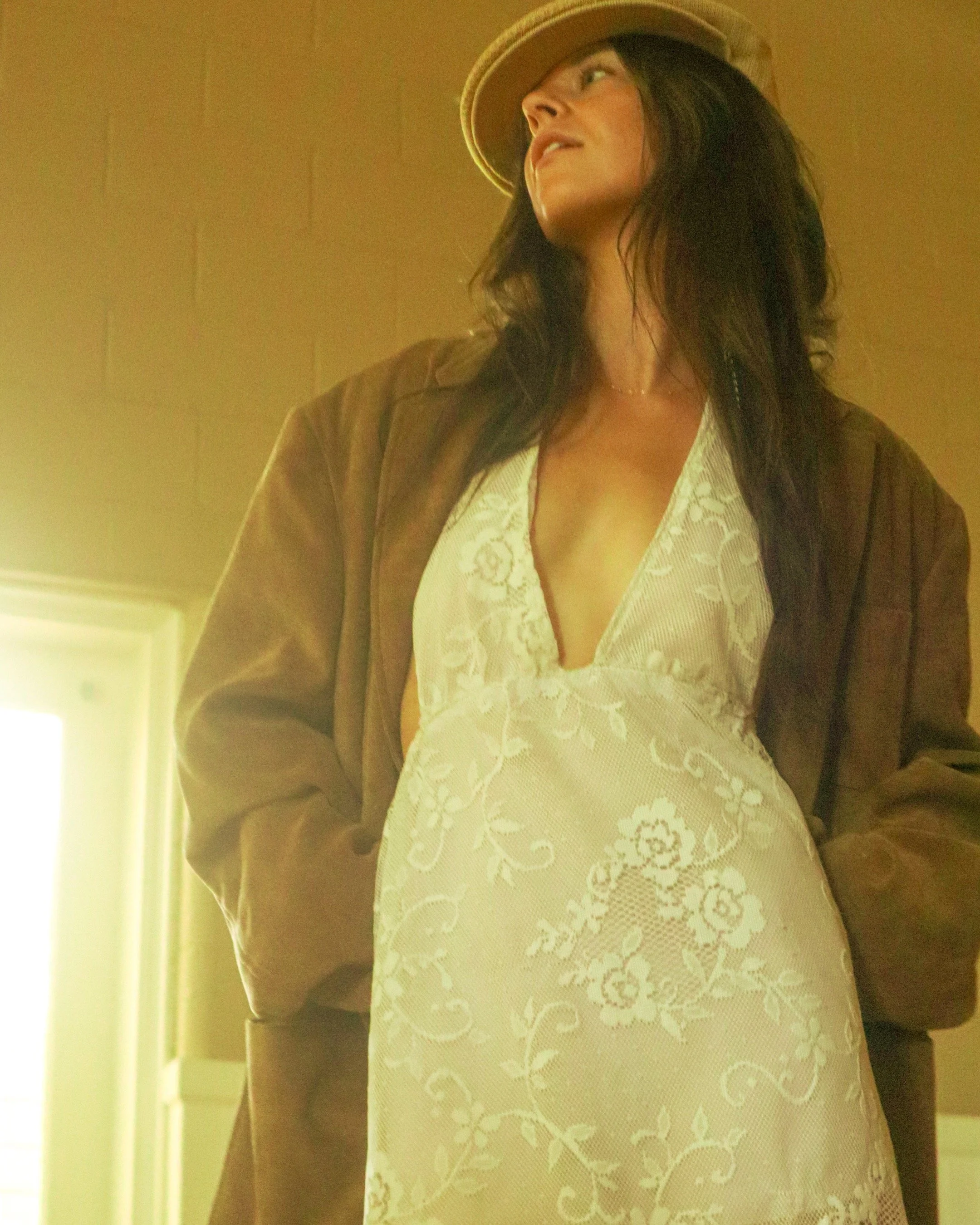 A woman wearing a hat, brown jacket, and white lace dress stands indoors near a window, looking to the side.