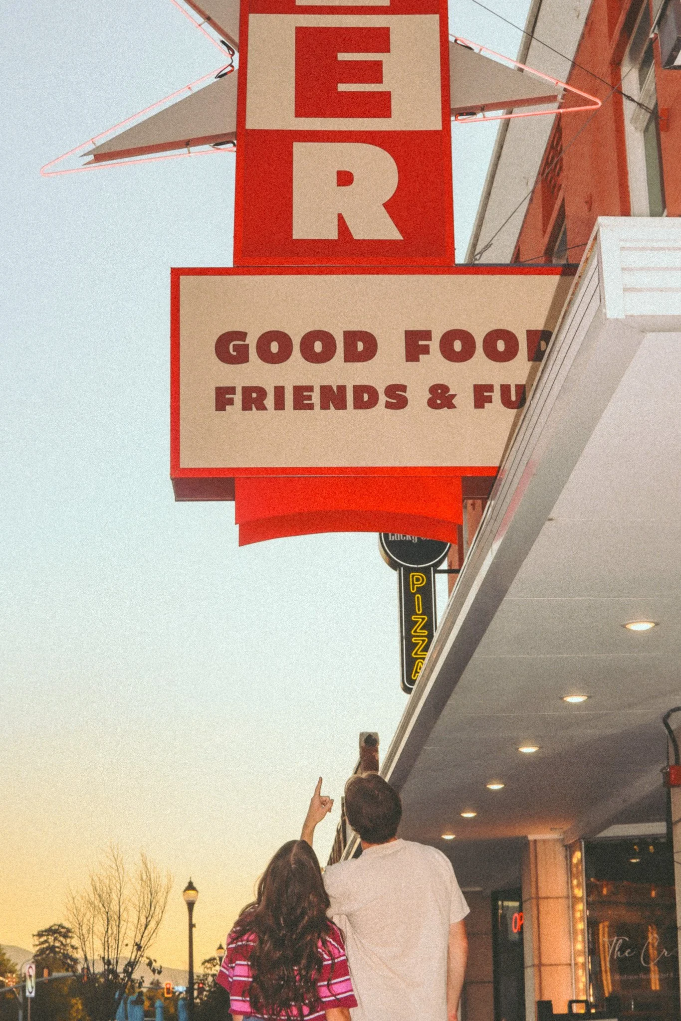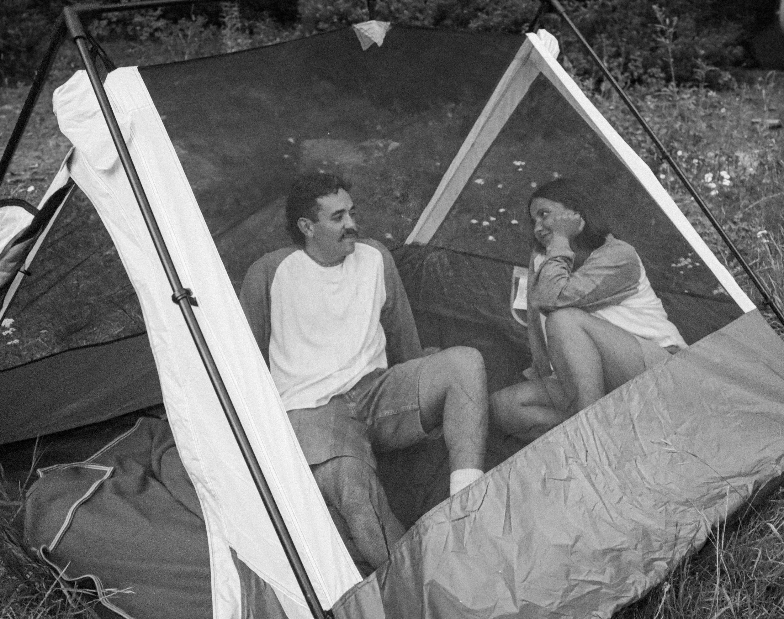 A man and a woman sitting inside a camping tent outdoors, looking at each other and smiling.