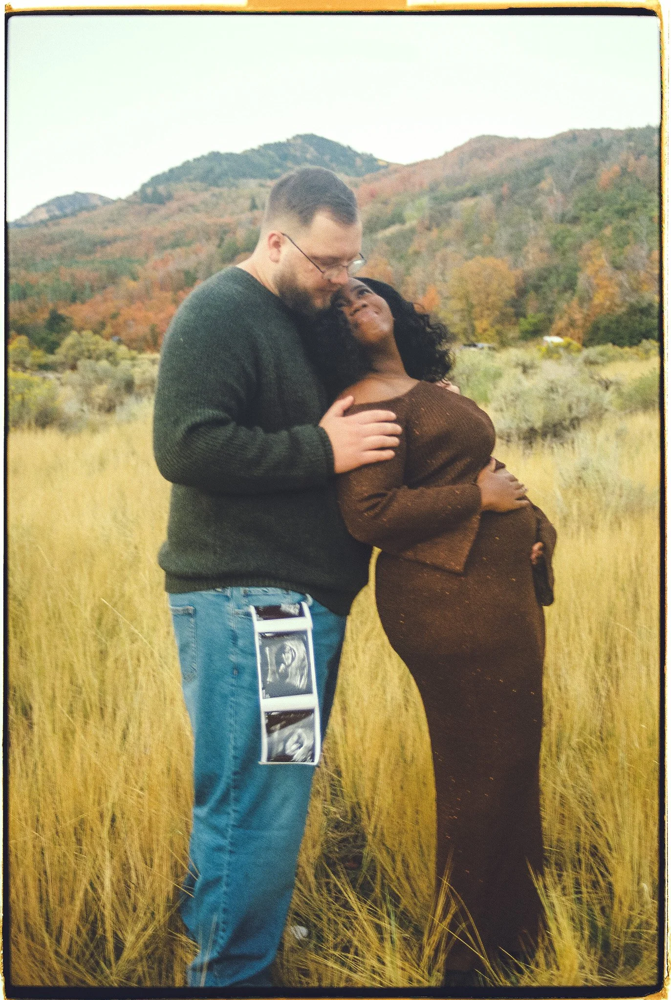 Two women hugging closely, with one woman’s arms around the other, their faces touching.