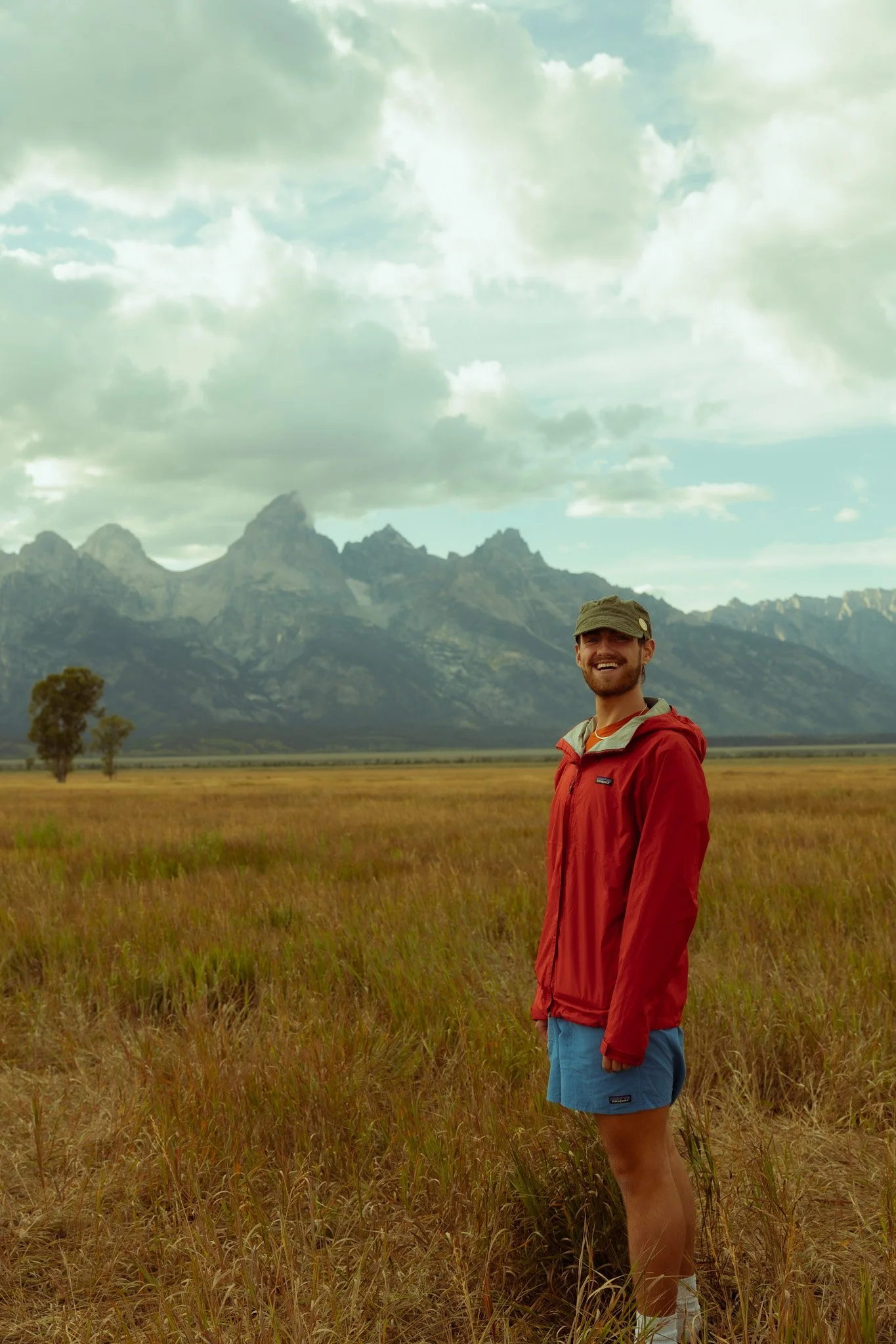 A man smiling in a red jacket and blue shorts standing in a grassy field with mountains in the background.