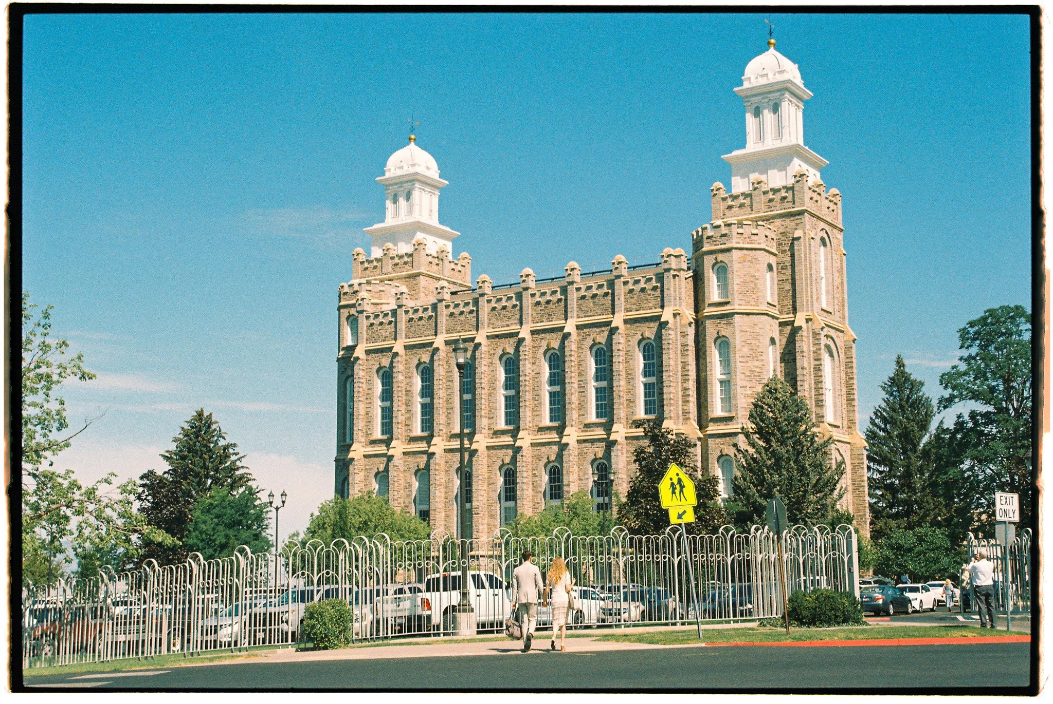 Historic courthouse with twin towers, stone and brick construction, surrounded by trees and a parking lot, with people walking nearby.