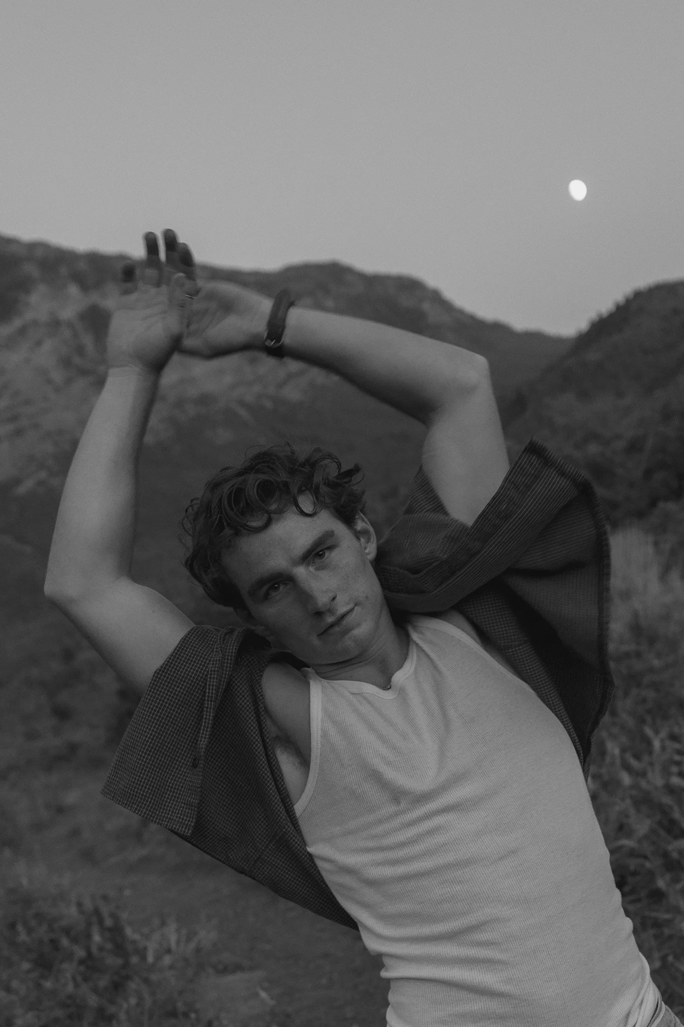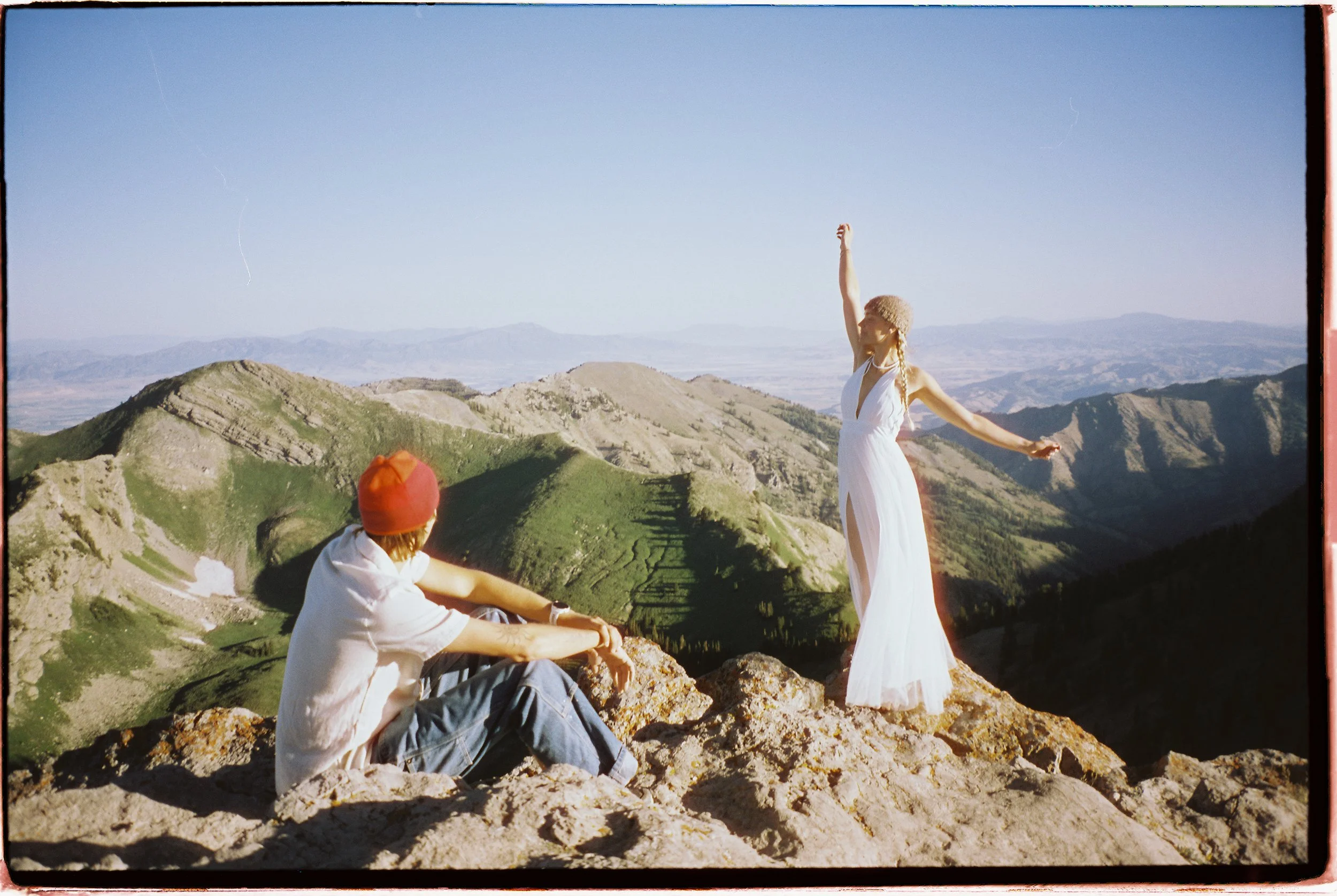 A woman in a white dress standing on a rocky mountain ridge with arms raised, and a man sitting on a rock taking a photo of her, with green mountains and a blue sky in the background.