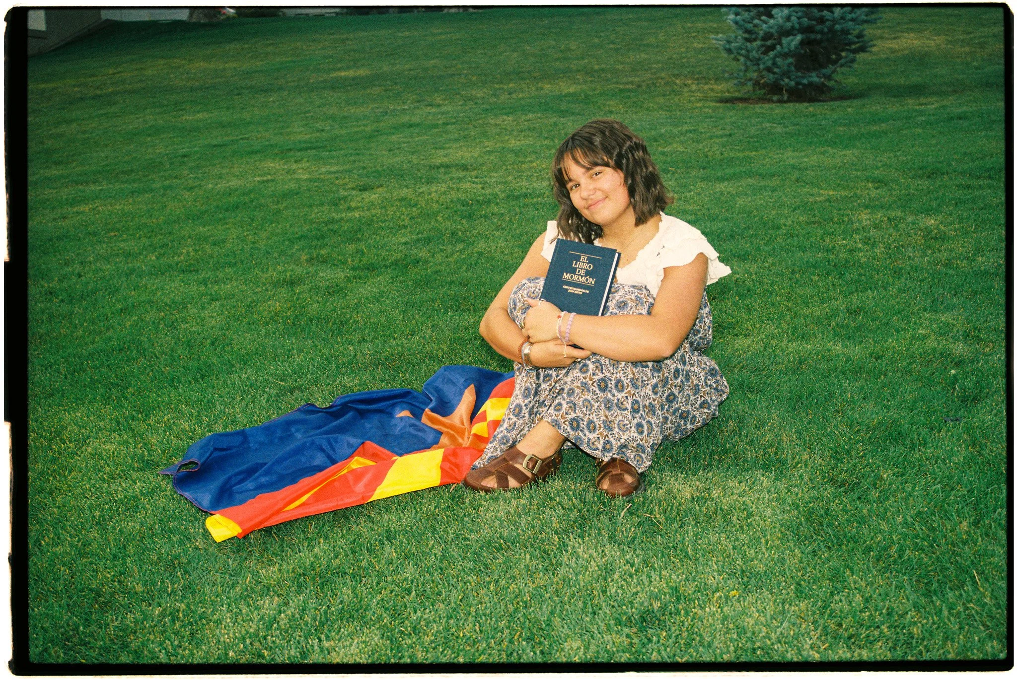 A young girl with dark hair wearing a patterned dress and brown sandals is sitting on green grass outdoors. She is holding a copy of the Book of Mormon and smiling at the camera. A colorful blanket is spread on the grass nearby, and a small tree is in the background.